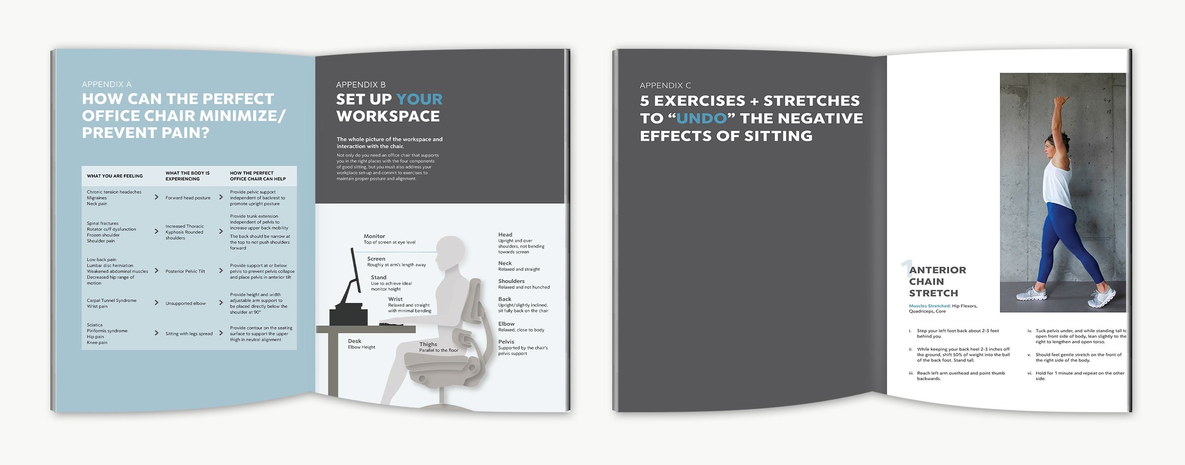 - Bonus Content: How the perfect office chair can help minimize/prevent pain; how to setup your workspace, and five exercises and stretches to undo the negative effects of sitting.