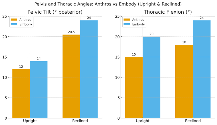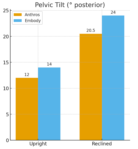 Anthros reduced posterior pelvic tilt by 2° for males and 4° for females at the start of sitting—promoting a more upright, healthier seated posture than Embody.